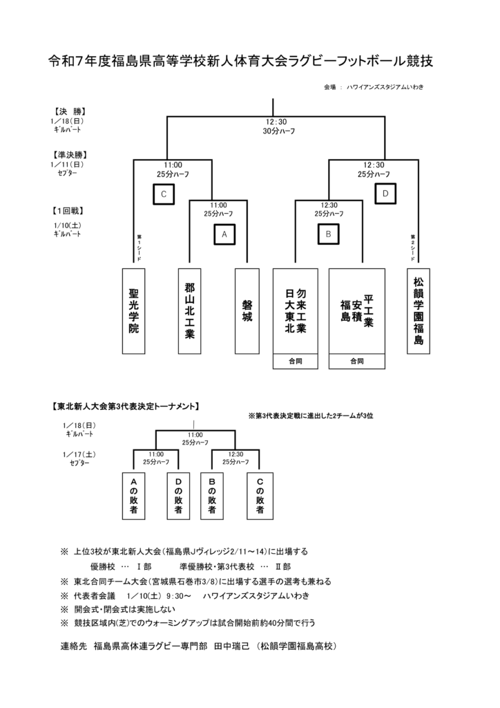 令和7年度福島県高等学校新人体育大会ラグビーフットボール競技 2025年12月15日 最終更新日時 : 2025年12月15日 admin 令和8年1月10日(土)より、ハワイアンズスタジアムいわきにて令和7年度福島県高等学校新人体育大会ラグビーフットボール競技が開催されます。ぜひ会場まで足を運んでいただき、高校生の熱い戦いに胸を躍らせてください!!