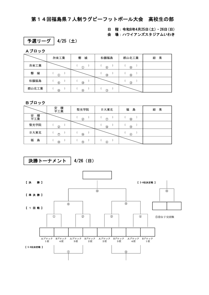 4月25日(土)・26日(日)に、ハワイアンズスタジアムいわき において、第14回福島県7人制ラグビーフットボール大会(高校生の部)兼 第13回全国高等学校7人制ラグビーフットボール大会予選会が実施されます。ぜひ会場まで足をお運びいただき、熱い戦いを繰り広げる高校生達に声援をお願いいたします。